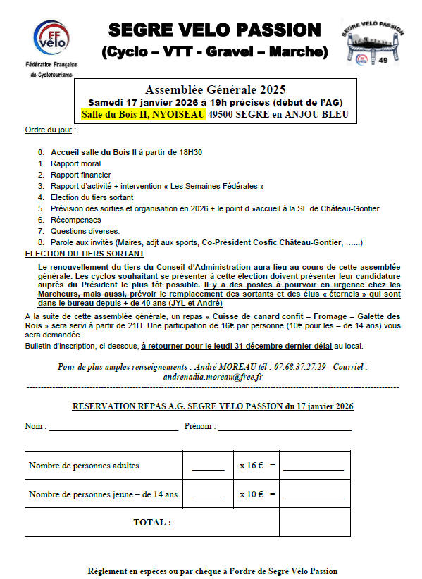 Assemblée Générale 2023 + 50ème Anniversaire du Club Samedi 13 janvier 2024 Au restaurant « Le Rendez-vous des Chasseurs » à SEGRE |